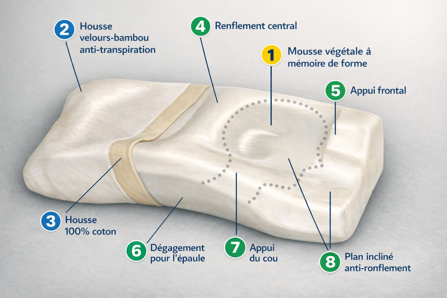 Sa forme spécifique intègre un renflement central et une inclinaison douce qui accompagnent le basculement naturel de la tête sur le côté. En limitant le sommeil strictement dorsal, Nyxea contribue à maintenir des voies respiratoires plus dégagées et à réduire les ronflements liés à la position.